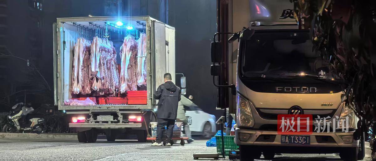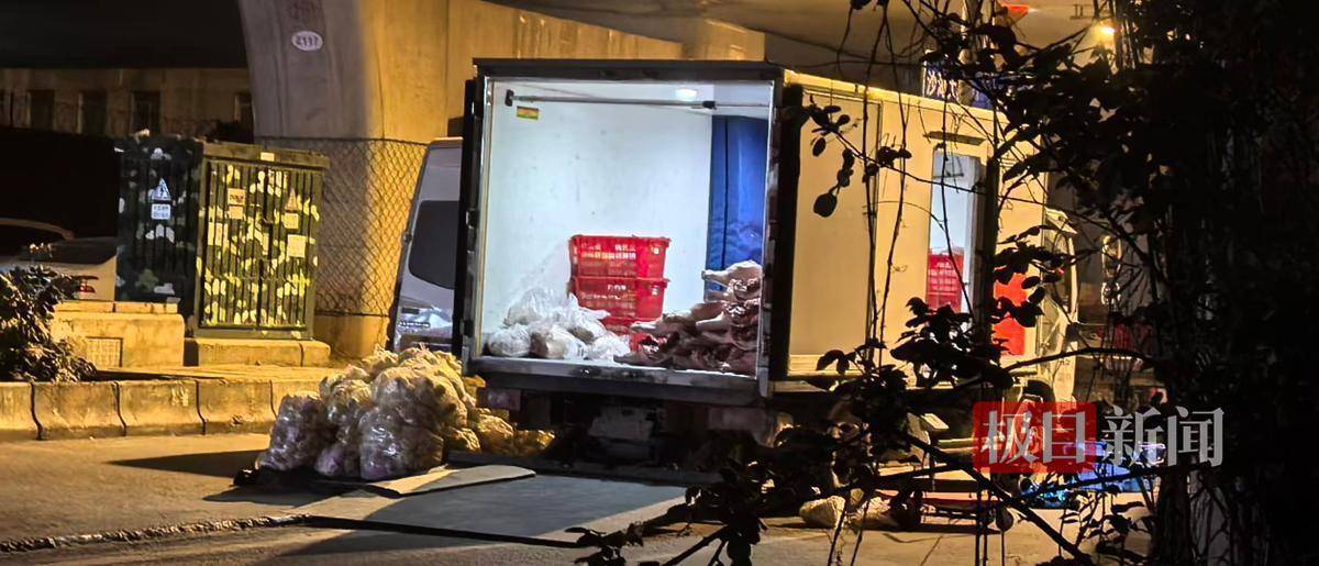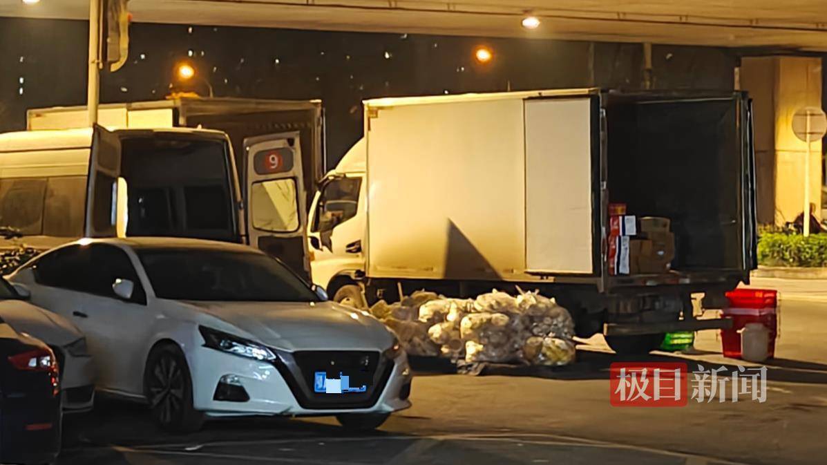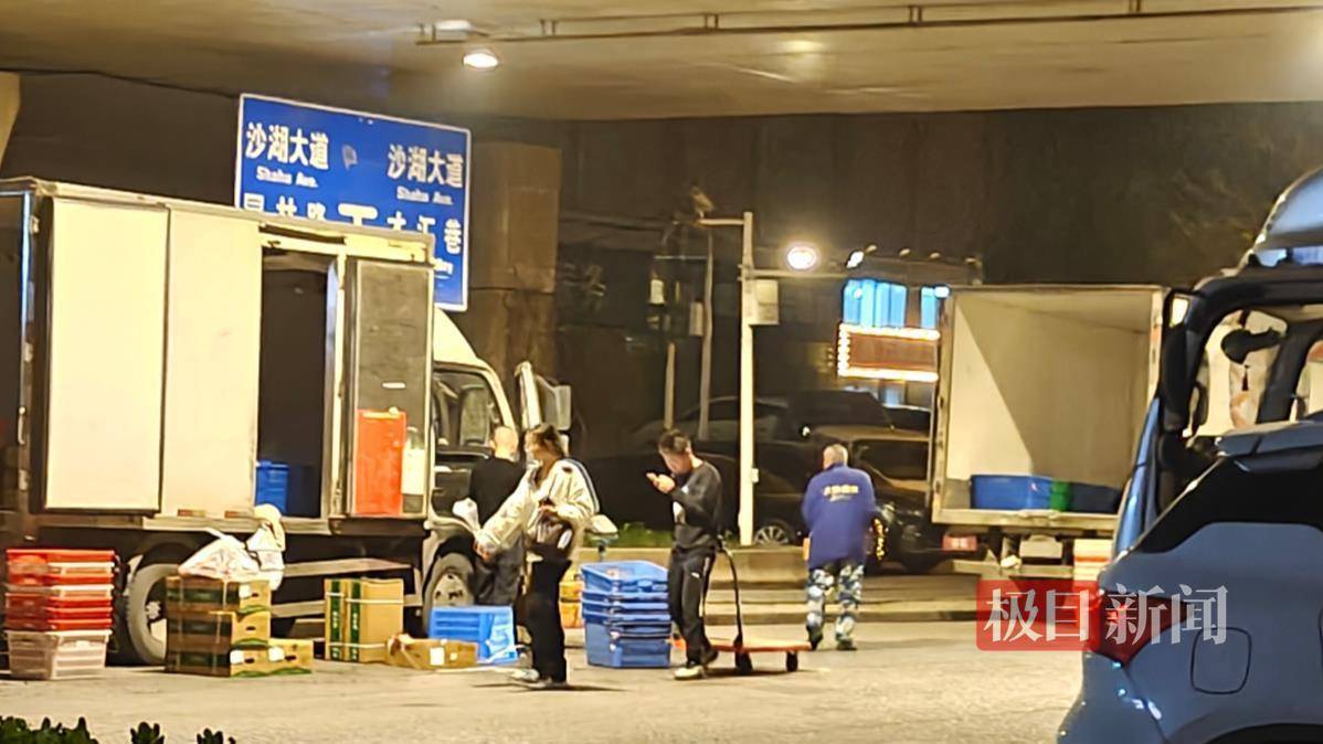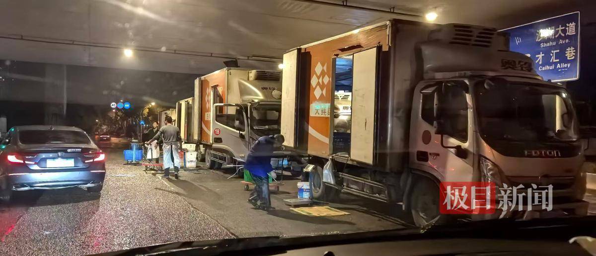 当晚10时50分左右,一辆面包车和第三辆冷链车几乎同时抵达;5分钟后,第四辆冷链车到来。记者注意到,当晚有一辆车车身印有“天鲜配”字样,其他车辆无明显标识。在昏暗的桥下灯光中,成盒物品被直接卸在马路上,转运作业持续进行。直至当晚12时记者离开时,仍有数辆冷链车滞留现场。