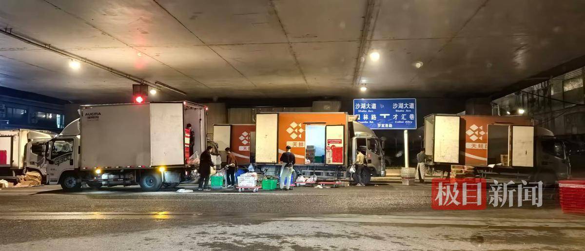 连续两晚探访中记者发现,该路段深夜仍不时有车辆通行,分货车辆停靠在路边,货物直接堆放在机动车道上分拣、转运,带有“天鲜配”标识的车辆均出现在现场。记者查询发现,“天鲜配”是武汉某农业科技公司旗下生鲜连锁品牌,汇集新鲜蔬菜、水果、禽肉、淡水鱼等3000多种生鲜产品,实行集团统一采购、冷链物流配送。